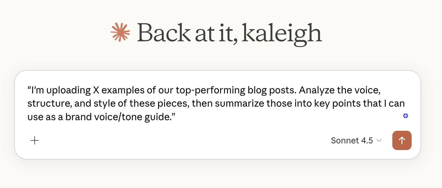 For example, you could use this prompt: "I'm uploading X examples of our top-performing blog posts. Analyze the voice, structure, and style of these pieces, then summarize those into key points that I can use as a brand voice/tone guide.”