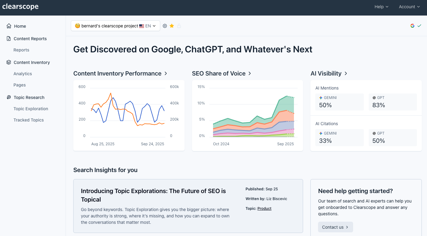 Clearscope is still the most reliable tool I've found for making sure content covers a topic thoroughly enough to compete. It analyzes top-ranking pages and surfaces the terms, subtopics, and related concepts your content needs to include in order to (hopefully) surface within AI search results.